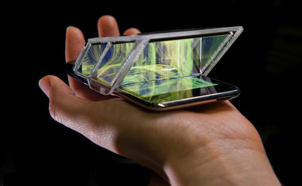 Non vous n’hallucinez pas la 3D sur Iphone est bien rêve possible grace a cet accessoire utilisant un procédé simple, trois images se superposent sur des miroirs semi-transparents permettant d’obtenir au final une image ou vidéo en 3D.