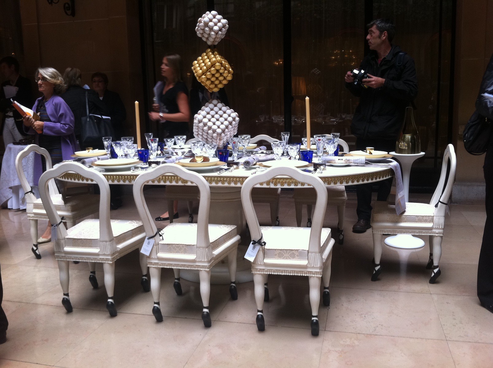 Ce fut l’occasion d’admirer autour de la table spécialement dressée les savoir-faire des maisons: Moissonnier (table), Orfèvrerie d’Anjou (seau à champagne), Garnier Thiébaut et Tissage Moutet (linge de table), Christofle (couverts), JL Coquet (assiettes), Manufacture HENRYOT & CiE – Style et Confort (sièges), Cristel (casseroles), Orfèvrerie Liberty (chandeliers et articles d’orfèvrerie), la Ciergerie des Prémontrés (bougies), Baccarat (verres), Tarrerias Bonjean (couteaux de cuisine), Puyricard (chocolats), Distillerie de la Verveine du Velay Pagès (liqueurs), Lenôtre (gourmandises) et l’hôtel Plaza Athénée (pâtisseries).