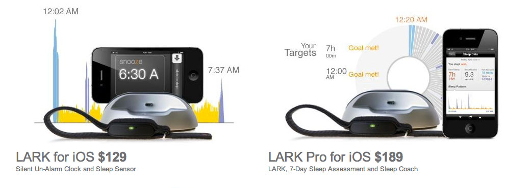 Lark pour Iphone est disponible en 2 versions qui comprennent de base l’application iOS, le dock et le bracelet auxquels s’ajoutent pour la version pro un logiciel de monitoring qui analyse les cycles de sommeil.